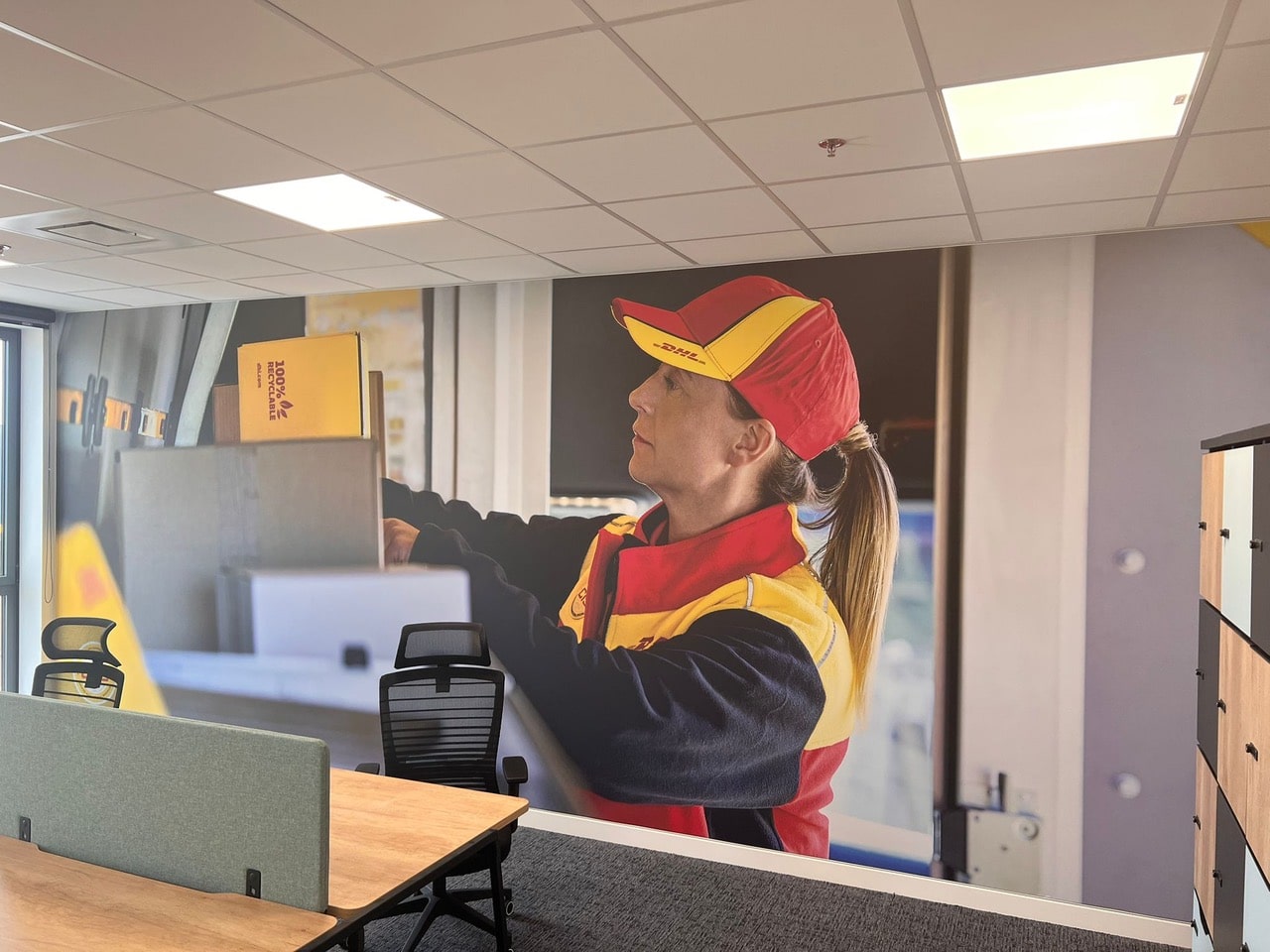 Pour rendre le site unique autour des couleurs de DHL et y embarquer ses 400 collaborateurs, la marque a retenu APS Communication pour la décoration des 24 000m² de bureaux et d’entrepôts.